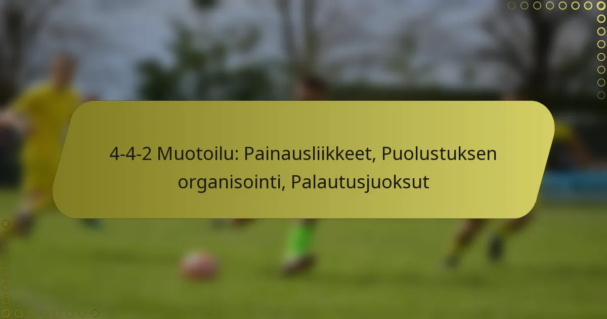 4-4-2-formaatio on taktinen asettelu, joka korostaa prässäyshetkiä, puolustuksen organisointia ja palautusjuoksuja joukkueen suorituskyvyn parantamiseksi. Prässäyshetket saavat pelaajat sitoutumaan vastustajaan strategisina hetkinä, kun taas tiivis puolustusrakenne varmistaa tehokkaan tuen ja nopeat siirtymät. Lisäksi palautusjuoksut ovat elintärkeitä puolustusrakenteen palauttamiseksi pallon menettämisen jälkeen, mikä mahdollistaa joukkueen haavoittuvuuksien minimoinnin hyökkääviä vastustajia vastaan.